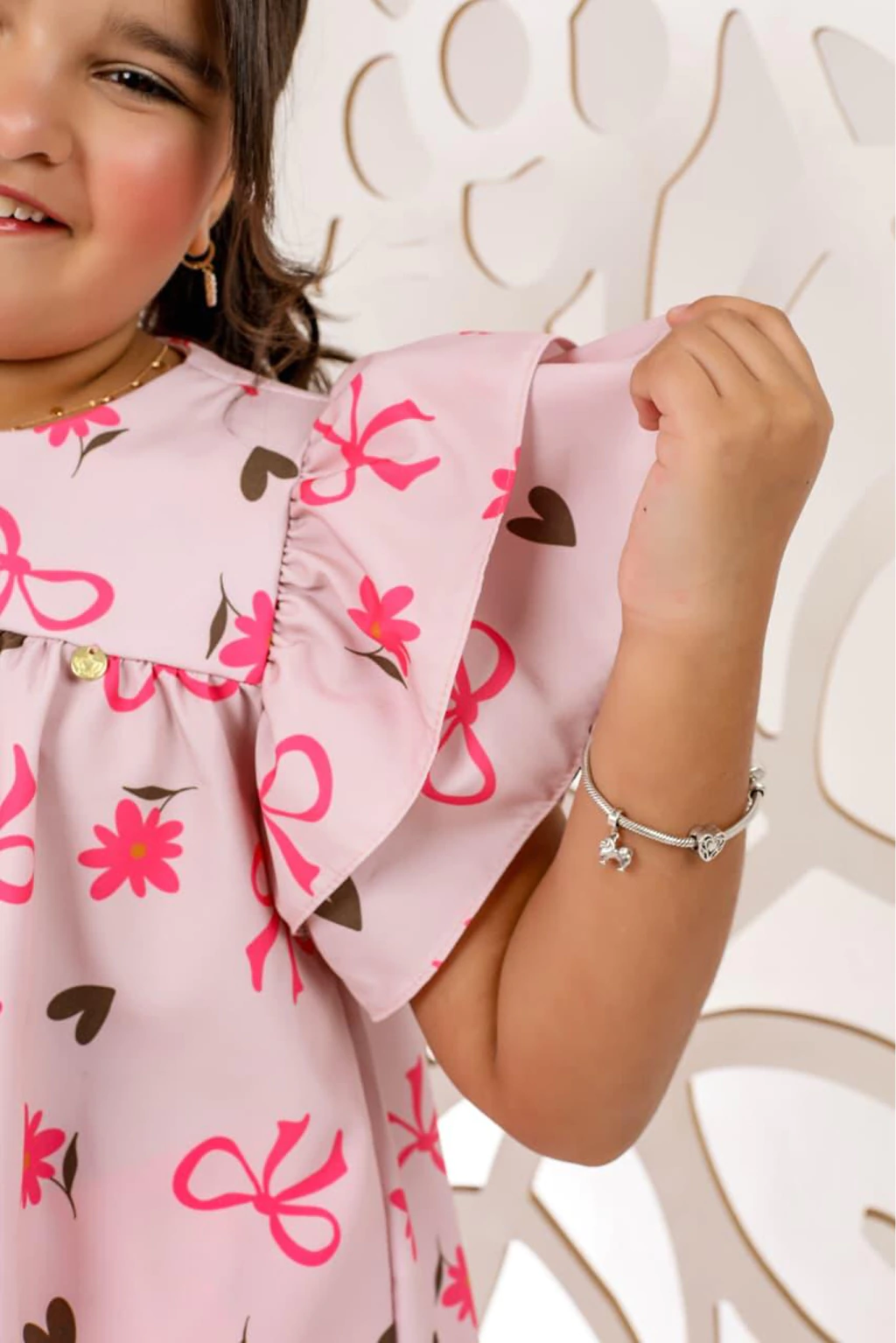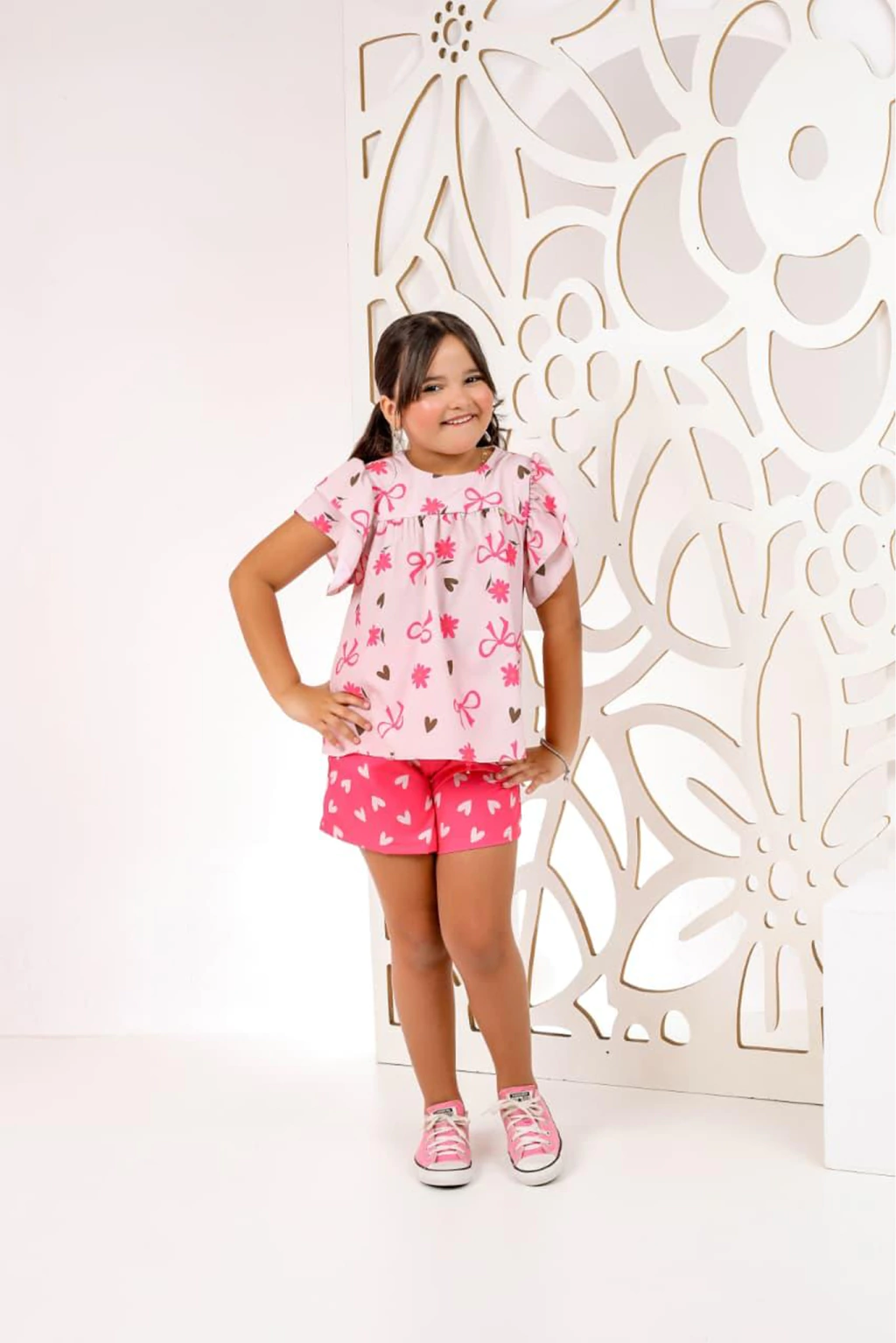 Descrição: A blusinha em tom rosa claro traz estampa delicada de laços, flores e corações, com detalhe em babadinho nas mangas, garantindo um charme especial e cheio de movimento. O short em rosa vibrante, estampado com corações brancos, complementa o visual com muito conforto e alegria.