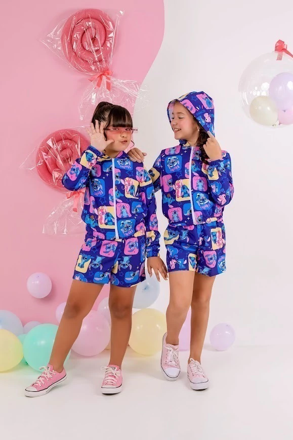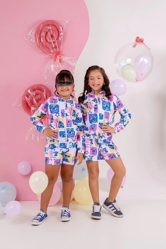 10 anos (Blusa 48 cm altura, 41 cm busto); Short (28 cm altura, 38 cm elastico esticado frente)