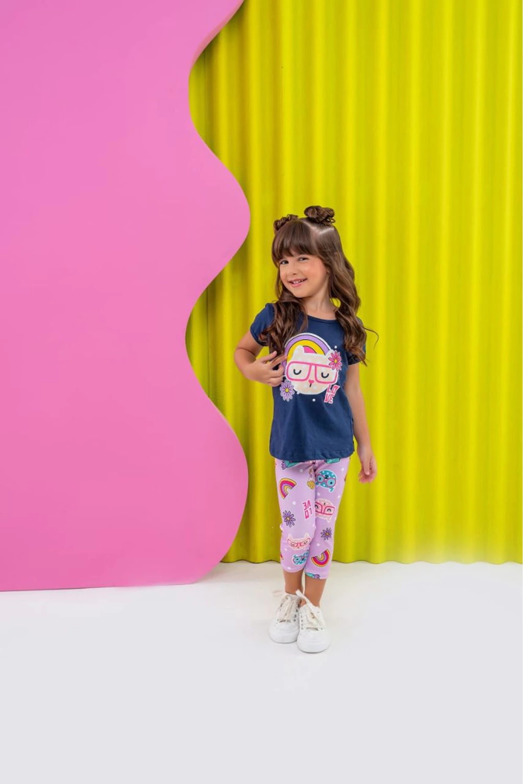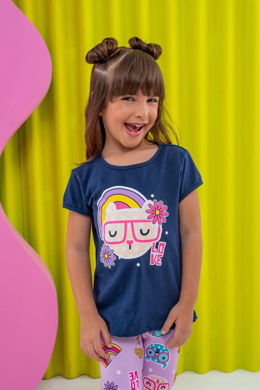 Detalhes: Deixe sua pequena brilhar com este lindo conjunto infantil cheio de cor e diversão! A blusa azul-marinho possui uma estampa super fofa de gatinho com óculos e arco-íris, trazendo um toque alegre ao visual. A calça legging rosa clara complementa o look com estampas variadas, incluindo gatinhos, corações, arco-íris e mensagens de amor, criando um efeito despojado e encantador. Feito com tecido leve e confortável, esse conjunto é ideal para o dia a dia, garantindo liberdade de movimento e muito estilo. Perfeito para passeios, brincadeiras e momentos especiais!
