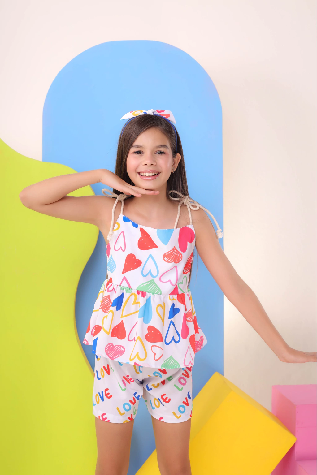 Detalhes: Encante-se com este lindo conjunto infantil! Com uma estampa delicada de corações coloridos e palavras de amor, ele traz um visual alegre e cheio de charme. O Look inclui uma tiara.