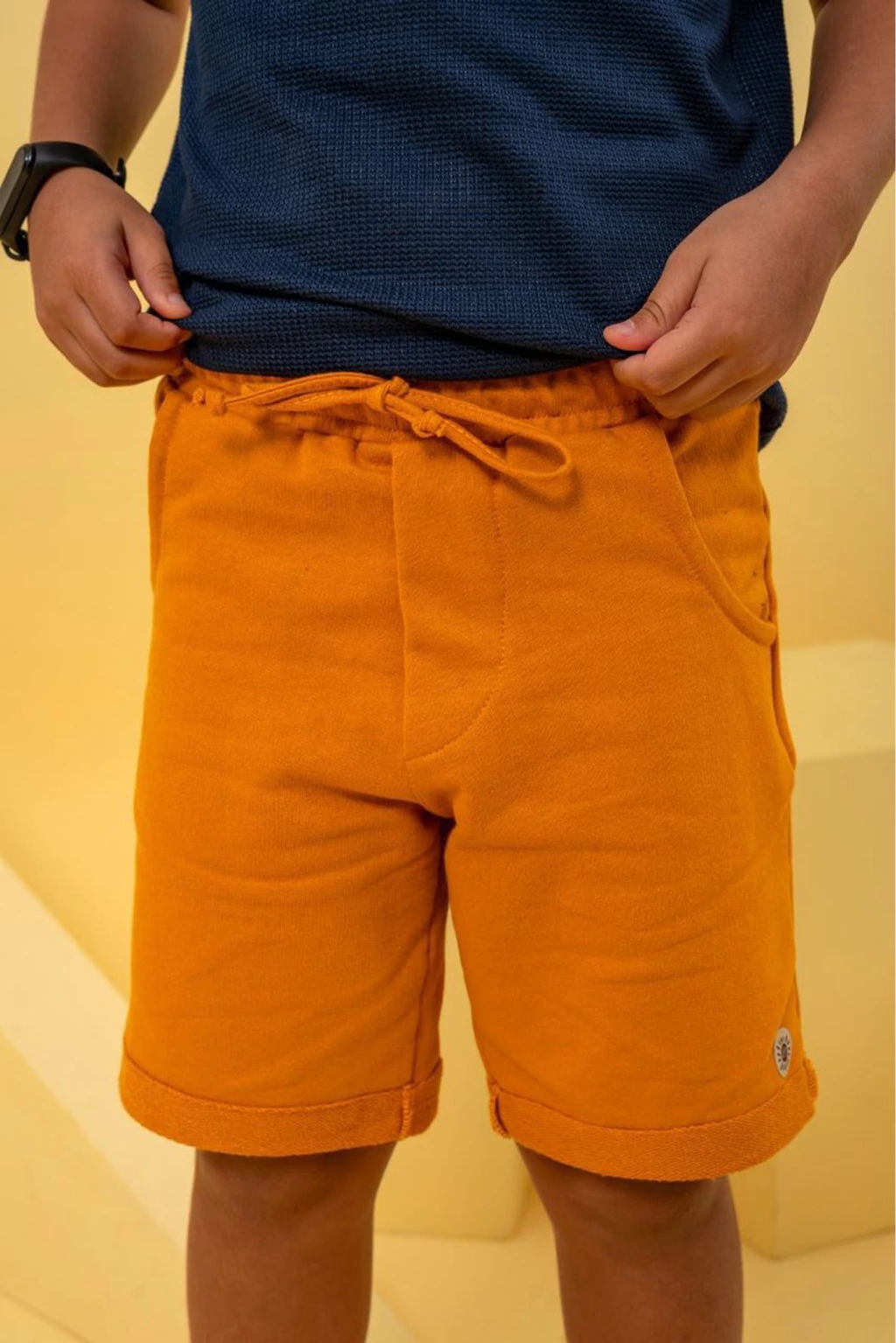 A bermuda, em tom amarelo mostarda, é feita em moletinho de algodão, com cós elástico e cordão para ajuste, garantindo máximo conforto e liberdade nos movimentos. Os bolsos funcionais e a barra dobradinha deixam o look ainda mais estiloso e prático.