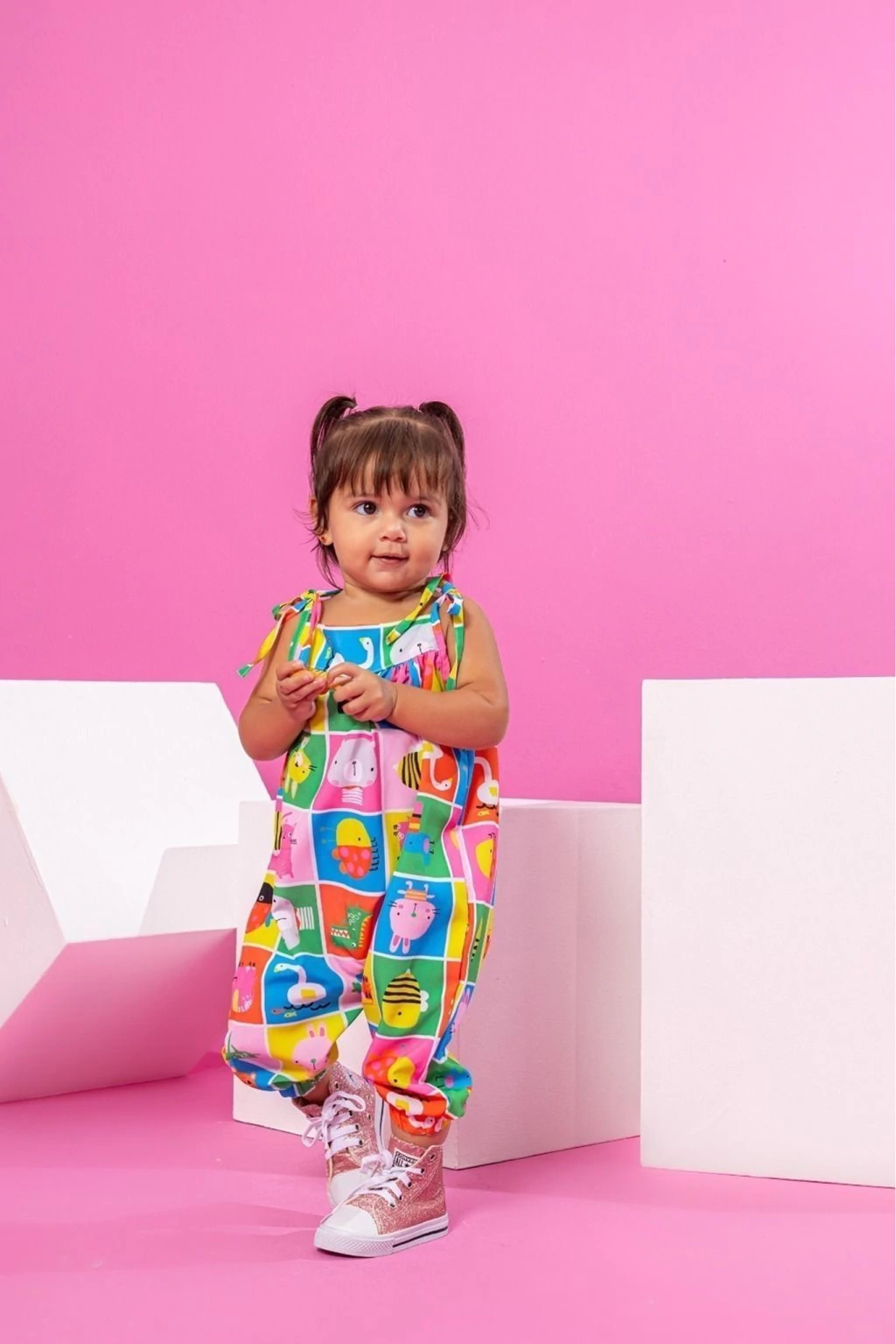 Detalhes: Um look cheio de fofura e diversão! Esse macaquinho saruel traz uma estampa super colorida com quadrinhos de bichinhos simpáticos como girafa, abelha, sapinho, porquinho e muito mais. Ideal para dias alegres e cheios de brincadeira, ele é feito em tecido leve e fresquinho, com alcinhas ajustáveis e elástico nas perninhas, garantindo conforto total e liberdade de movimento. Com visual moderno e lúdico, é a escolha perfeita para as pequenas brilharem em qualquer ocasião!