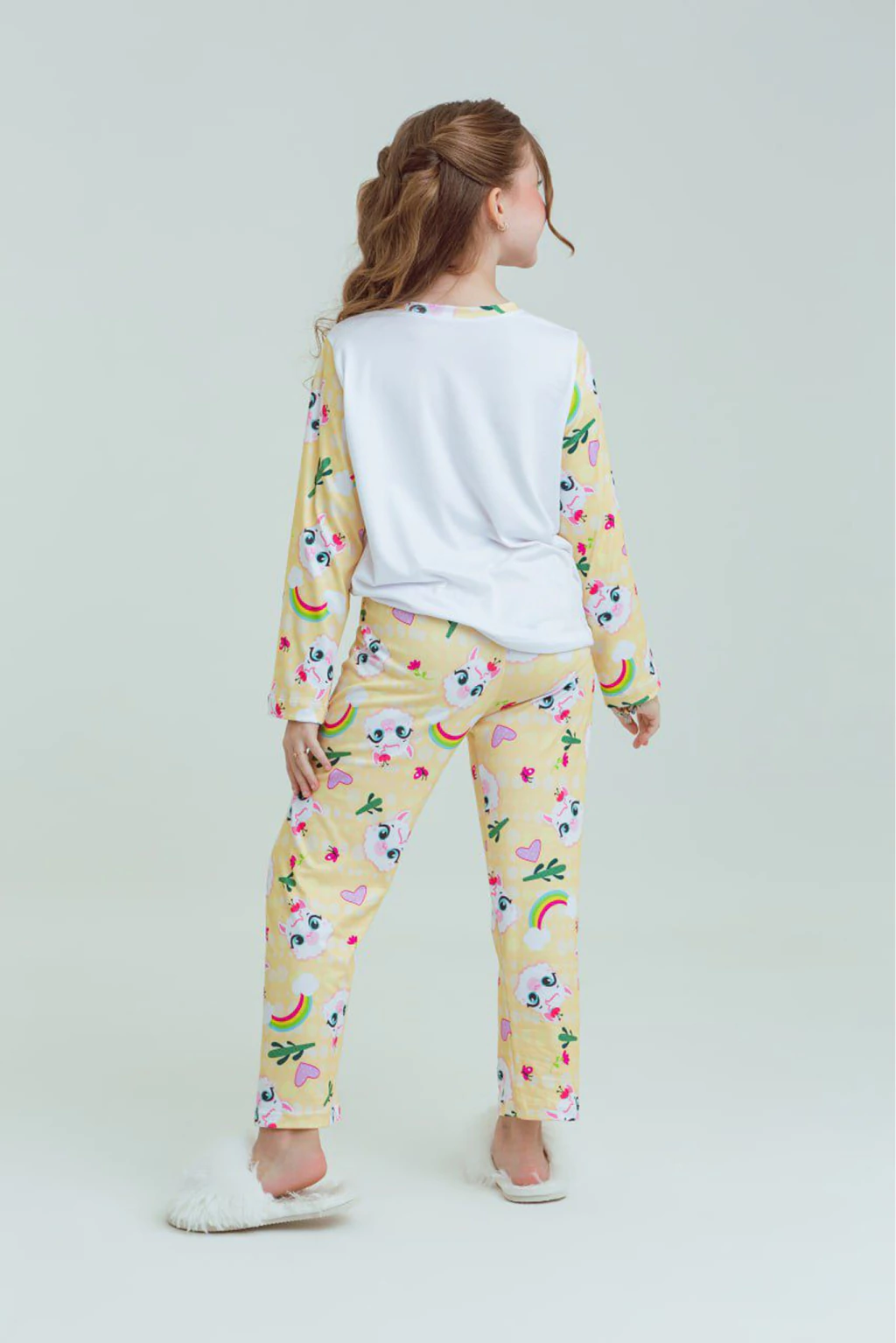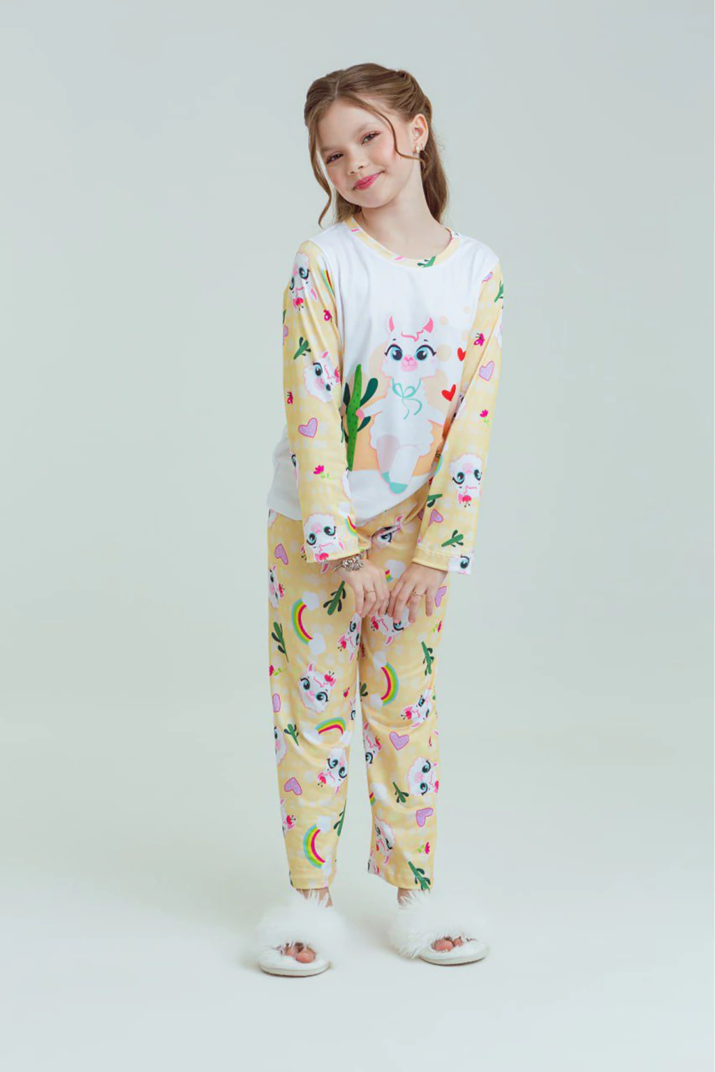 O conjunto possui blusa e calça com estampa super fofa de lhamas, arco-íris e corações em tons suaves. A blusa tem frente branca com uma ilustração grande e delicada, enquanto as mangas e a calça seguem o padrão estampado contínuo, criando um visual divertido e apaixonante.
