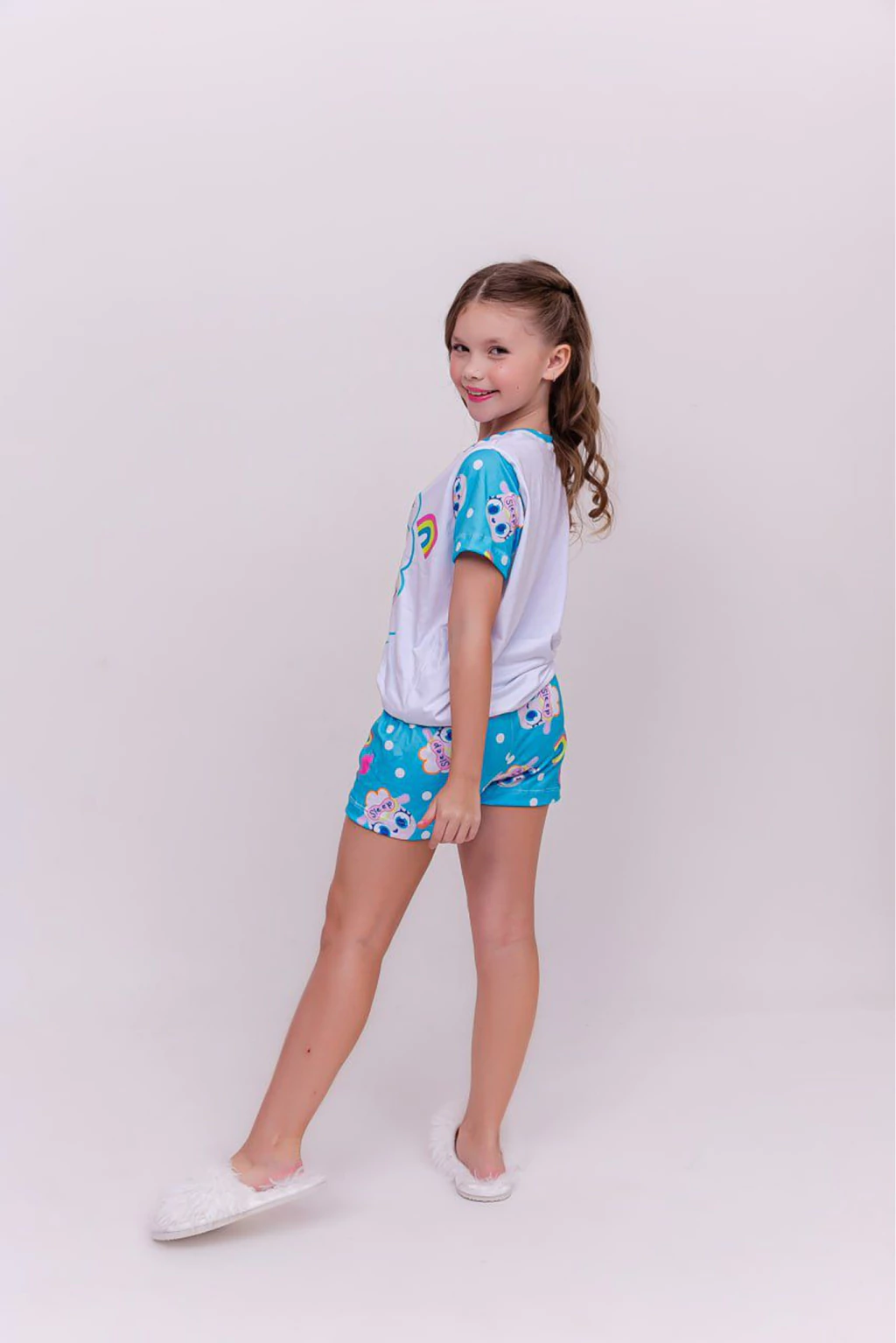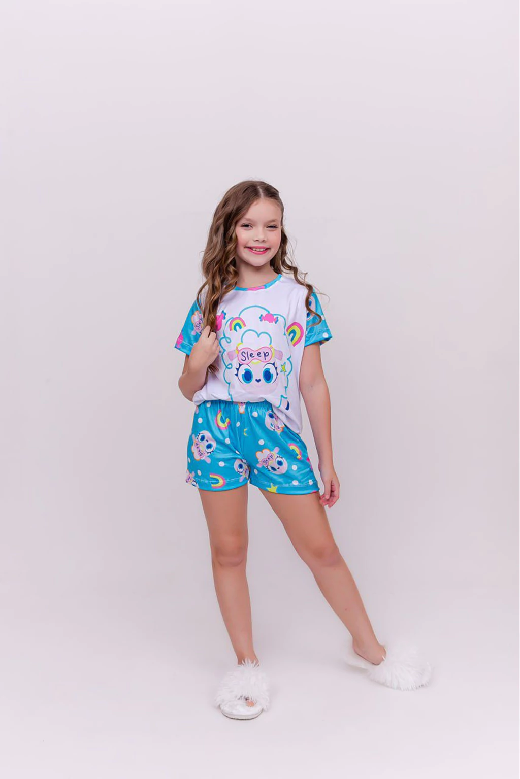 Descrição: Confeccionado em Suede Premium, este pijama oferece uma sensação de maciez e aconchego inigualáveis, como um abraço quentinho. O tecido aveludado é perfeito para uma noite de sono tranquila e relaxante. A camiseta branca destaca uma ovelhinha super fofa e sonolenta dentro de uma nuvem, com a palavra "SLEEP" (Dormir) e corações, borboletas e um arco-íris ao redor. Um convite direto para os bons sonhos. O short e as mangas em um lindo tom de azul turquesa são estampados com repetições da ovelhinha, nuvens, arco-íris e estrelas, criando um visual alegre e divertido.