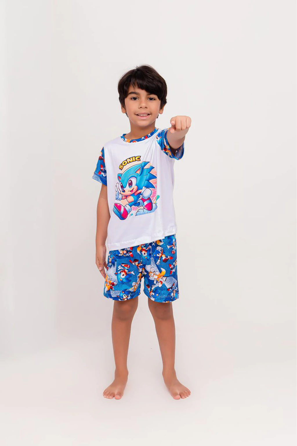 Descrição: Confeccionado em Suede Premium, um tecido com toque extremamente macio e aveludado, que proporciona uma sensação gostosa e aconchegante, ideal para uma noite de sono tranquila. A camiseta branca destaca o Sonic clássico em uma pose cheia de energia, com a palavra "SONIC" em destaque. O short e as mangas apresentam uma estampa corrida e alegre, cheia de elementos e personagens do universo Sonic, estimulando a imaginação antes de dormir.