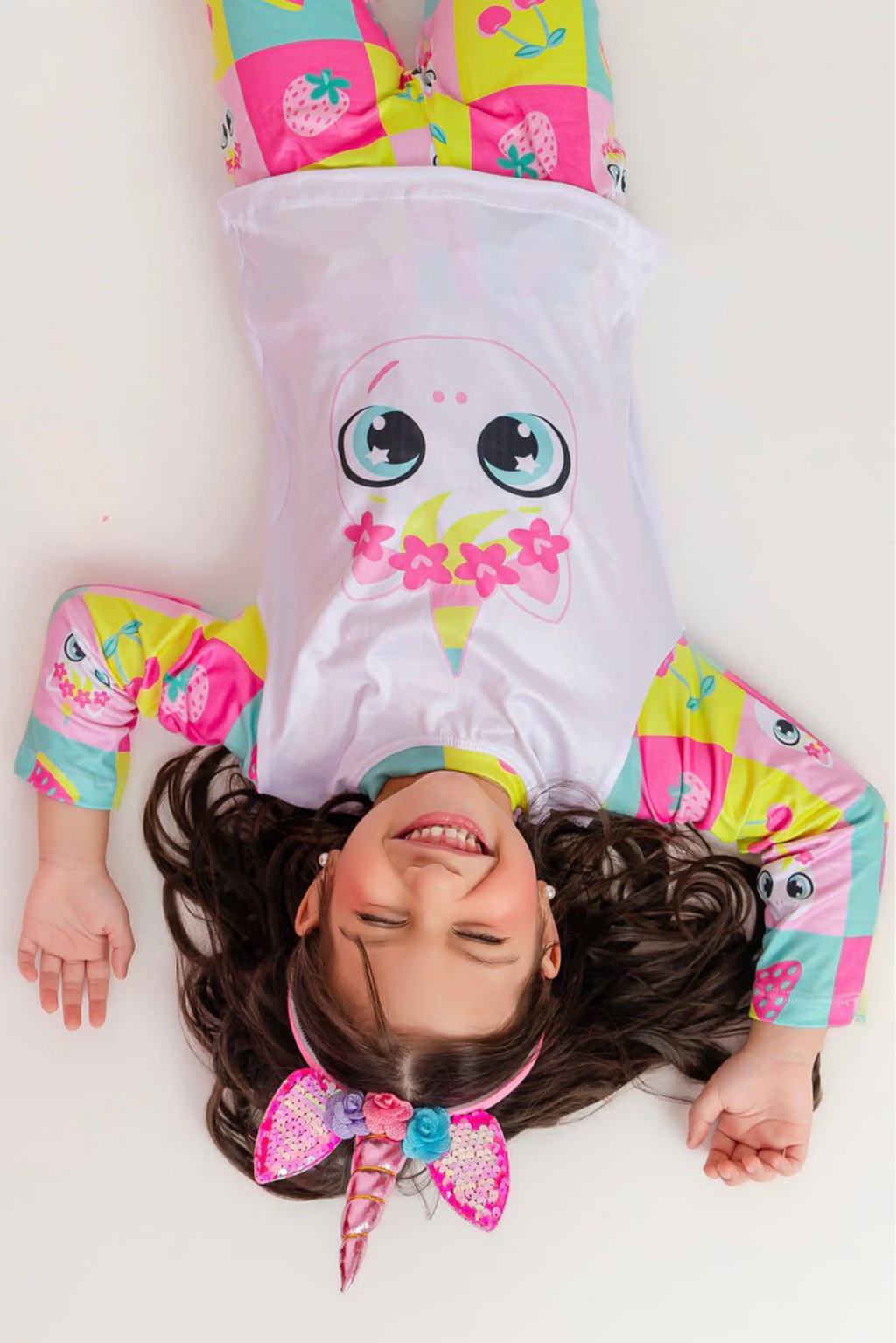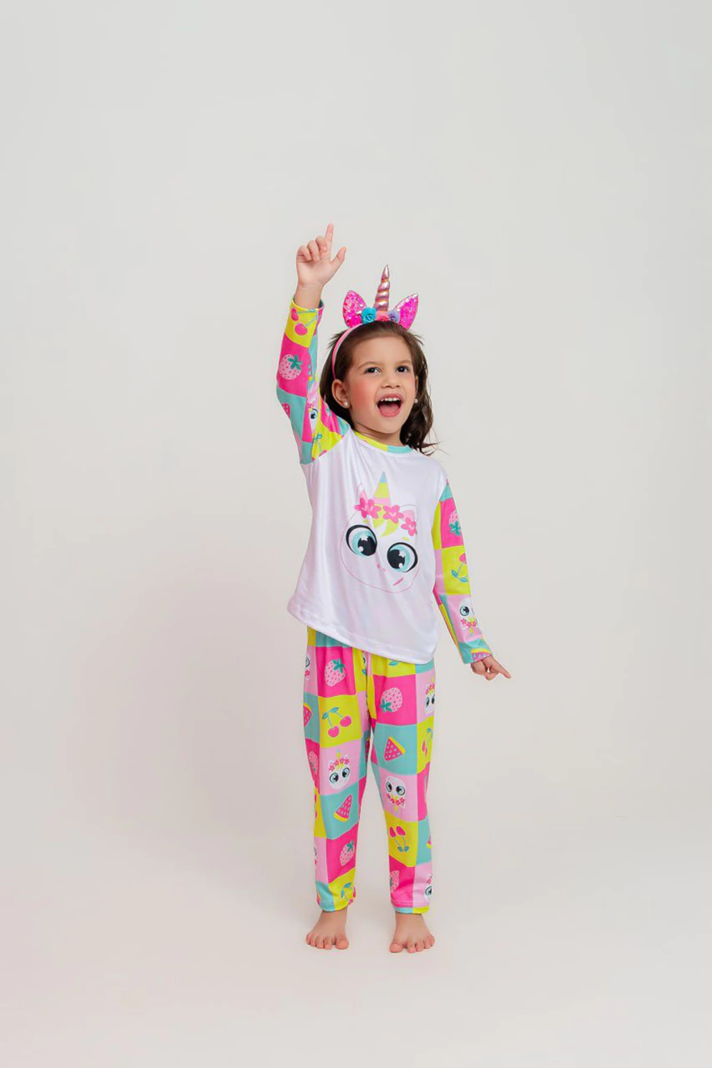 A blusa traz o rostinho fofo de um unicórnio com detalhes delicados e brilho suave, enquanto a calça é toda estampada com quadradinhos coloridos e desenhos divertidos, deixando o pijaminha ainda mais alegre e especial.