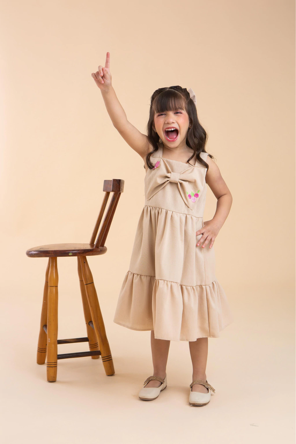 Com saia em camadas, alças largas e um belo laço aplicado na parte frontal, o modelo é puro charme. Para completar, o laço de cabelo acompanha o vestido, formando um conjunto encantador e cheio de personalidade.