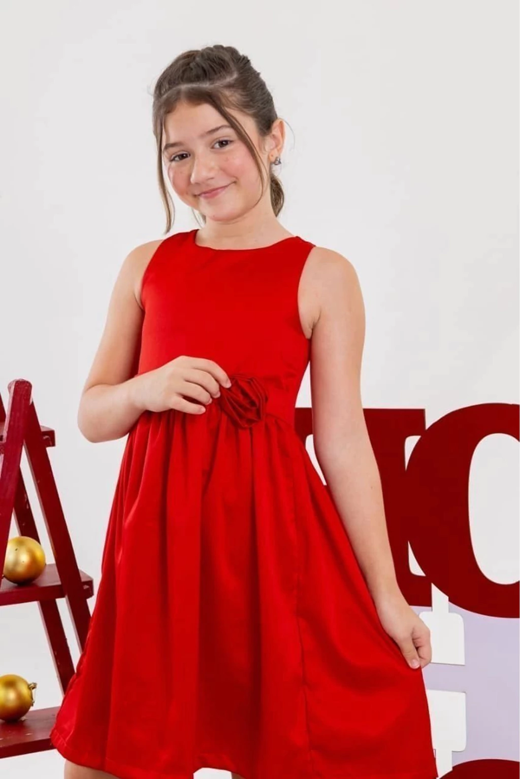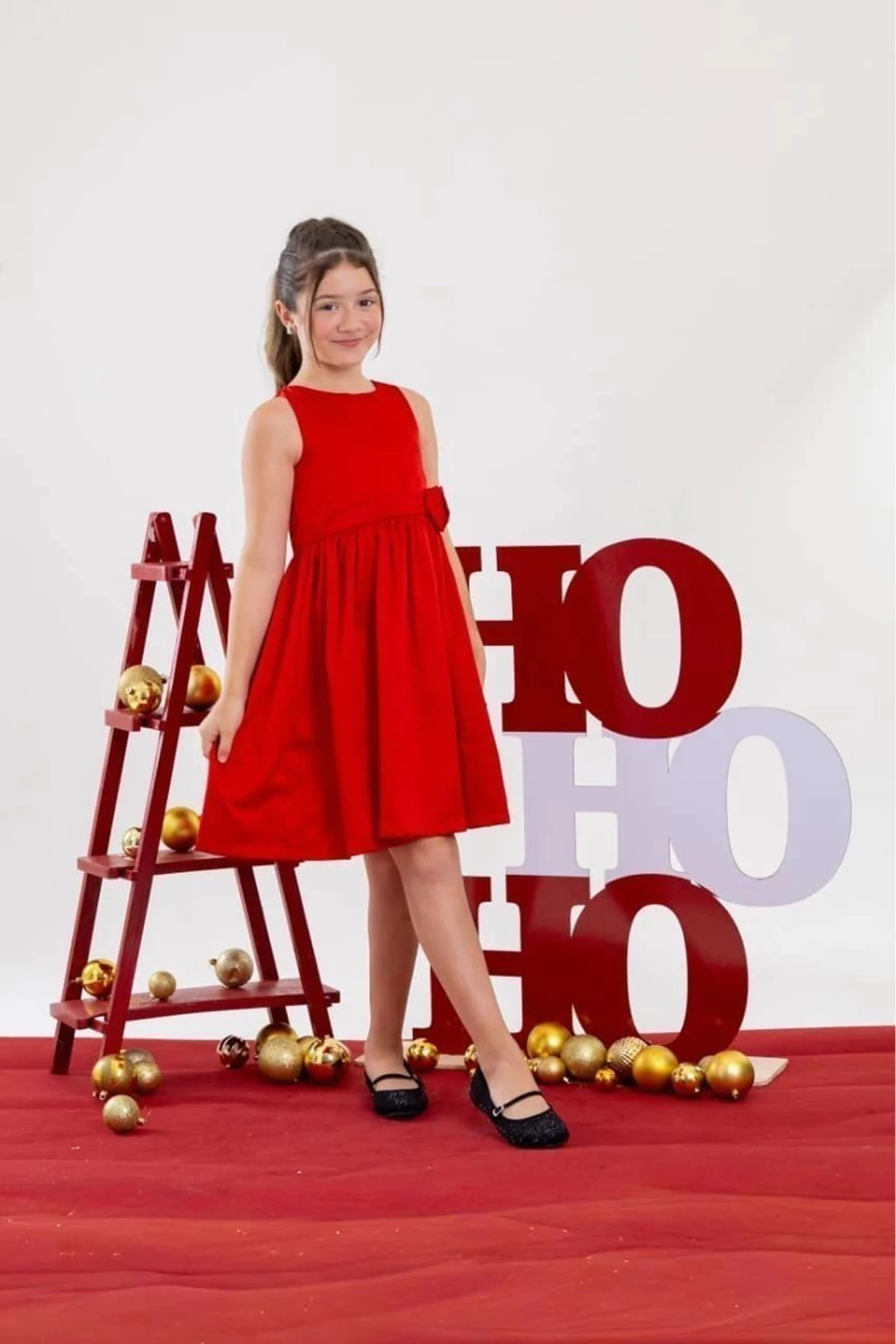 Com modelagem clássica, o vestido traz decote redondo, saia fluida rodadinha e um detalhe especial na cintura: uma florzinha delicada, que deixa a peça ainda mais graciosa e perfeita para ocasiões como Natal, festas, apresentações e momentos especiais em família.