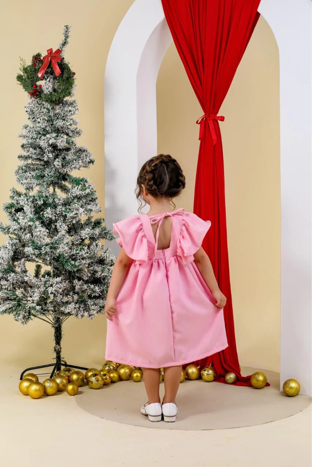 Confeccionado em tecido leve e macio, o destaque vai para as mangas com babados volumosos, que trazem um toque romântico e sofisticado ao visual. O tom rosa suave transmite doçura e elegância, tornando o vestido uma escolha encantadora para o Natal, aniversários e eventos especiais.