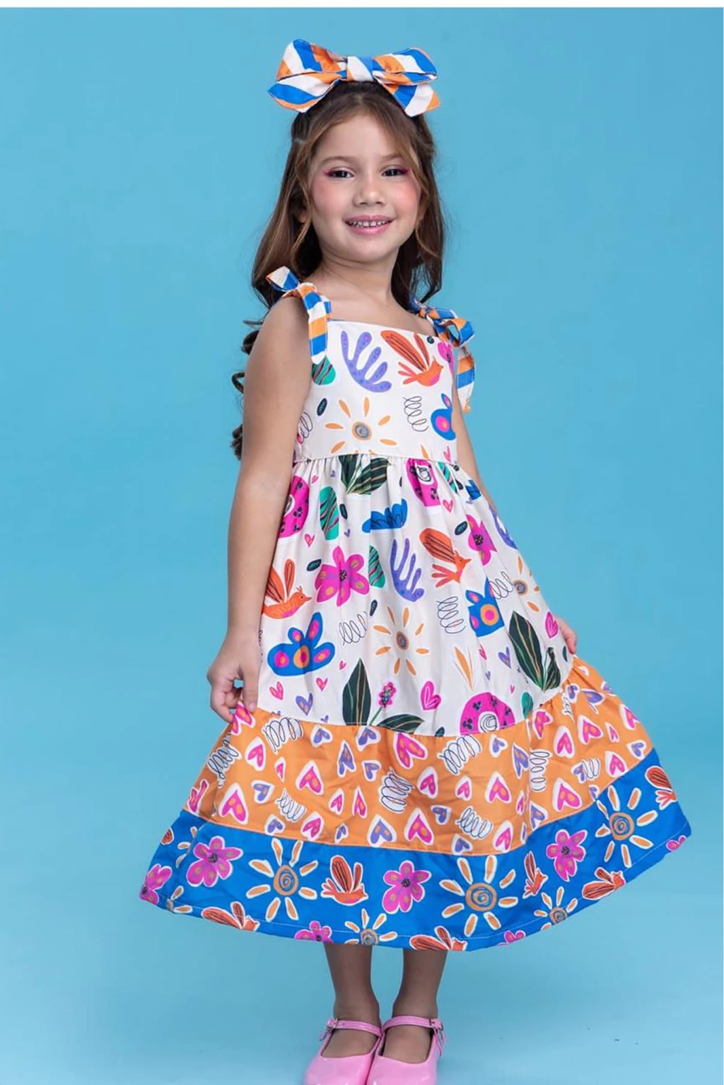 Descrição: Um look cheio de alegria e estilo para as pequenas arrasarem! Esse vestido longo é confeccionado em tecido leve e fresquinho, com uma estampa supercolorida que mistura flores, corações e elementos divertidos. O modelo possui alcinhas com amarração nos ombros, saia rodada em camadas e comprimento midi, garantindo movimento e delicadeza.
