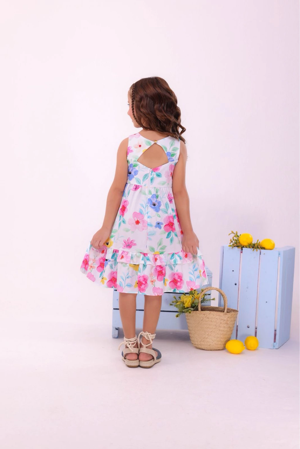 Detalhes: Confeccionado em tecido macio, ele apresenta estampa vibrante de flores em tons de rosa, amarelo e azul, trazendo um toque alegre e cheio de charme. O modelo conta com corte rodado, babado na barra e detalhe especial nas costas com abertura em formato de gota, garantindo frescor e estilo. Ideal para passeios, festas ou momentos especiais, proporcionando conforto e beleza para sua pequena brilhar.