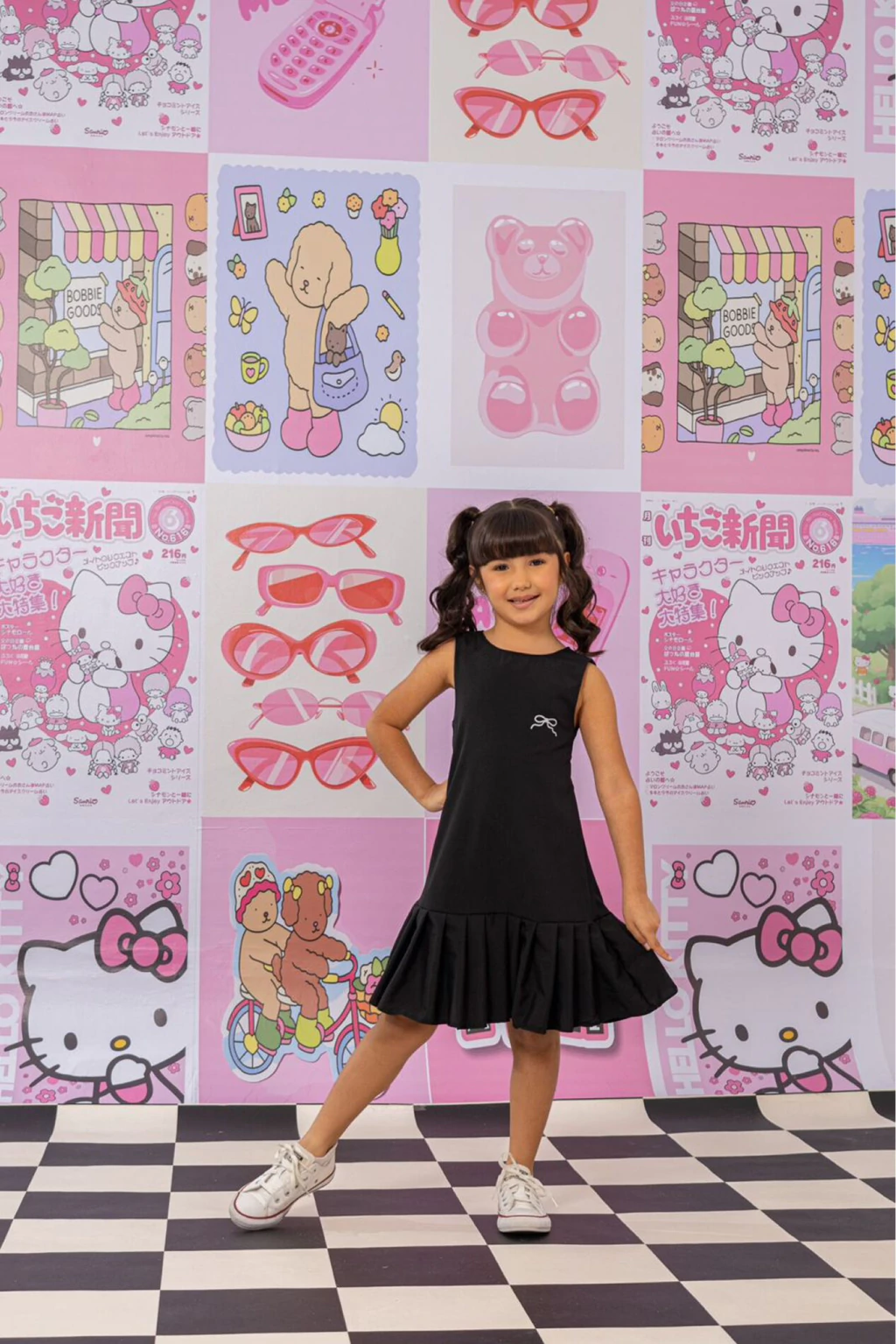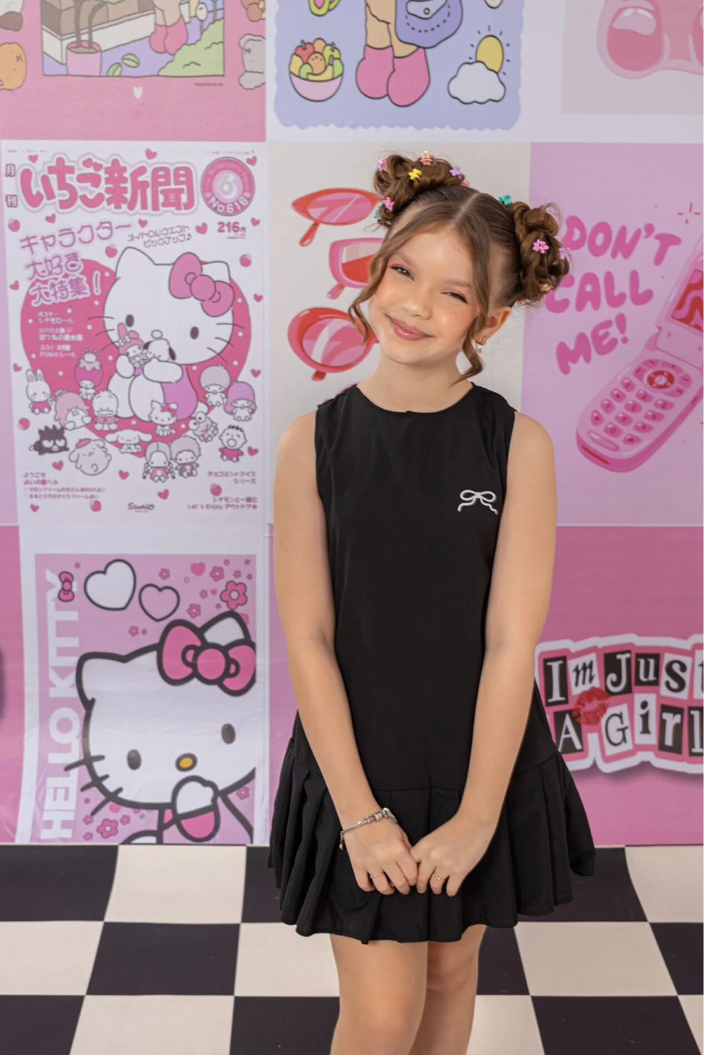 Detalhes:Confeccionado em tecido leve e confortável, ele possui modelagem reta com detalhe de babado na barra, proporcionando um toque delicado e divertido ao visual. A pequena estampa de lacinho no peito adiciona charme sem perder a elegância. Ideal para passeios, festas ou até um look casual com tênis, como na foto. Combine com acessórios e deixe a imaginação das meninas brilhar!
