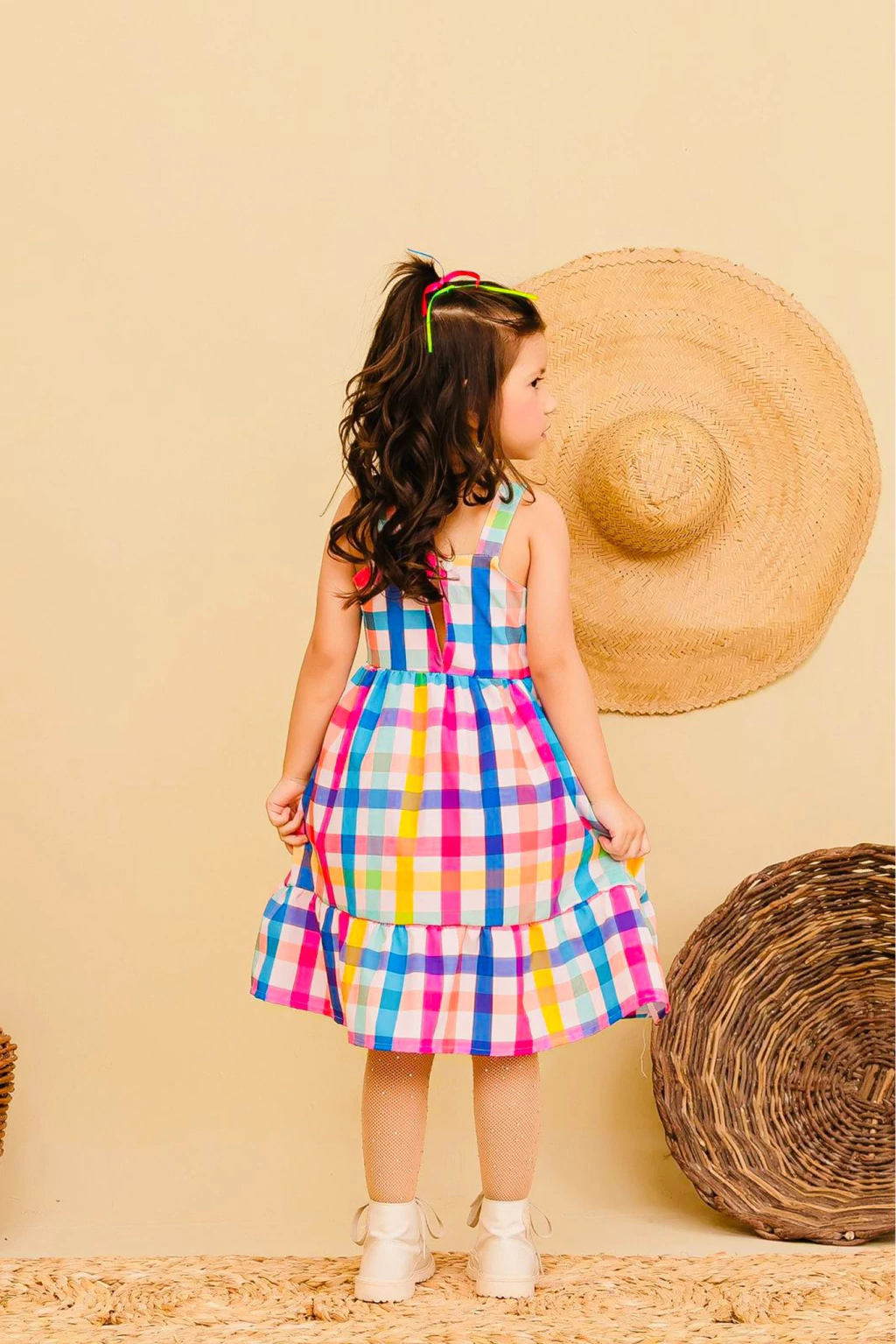 Detalhes: Deixe o look da sua pequena ainda mais encantador com este vestido infantil supercolorido e cheio de charme! Confeccionado em tecido leve e confortável, o modelo possui estampa xadrez vibrante com tons de rosa, azul, amarelo, laranja e lilás, transmitindo alegria e delicadeza em cada detalhe.