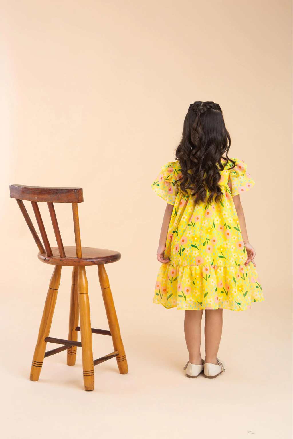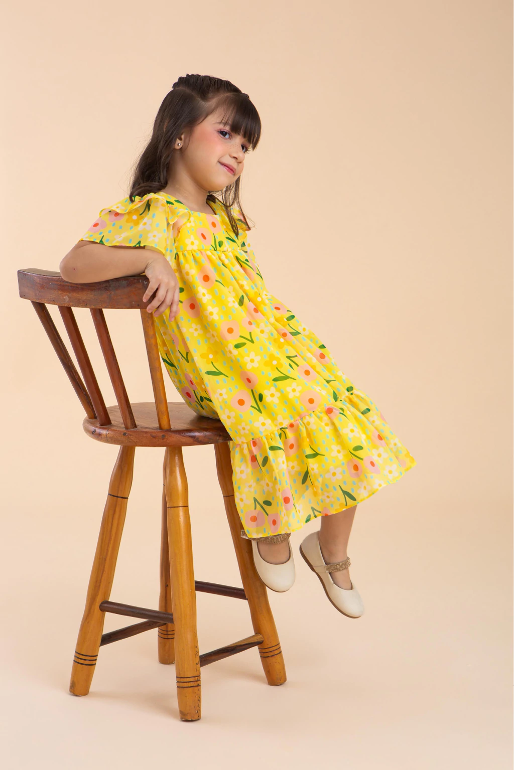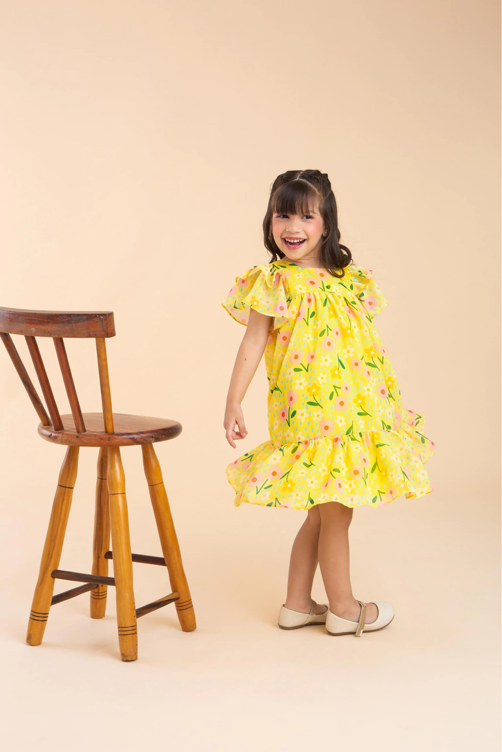 Descrição: Traga a alegria do sol para o guarda-roupa da sua pequena com este vestido incrivelmente charmoso e confortável. Com uma cor que ilumina, esta peça é perfeita para dias de festa e momentos de diversão. O corte é largo e confortável na parte superior, ideal para garantir total liberdade de movimento. A saia é finalizada com um único babado na barra, adicionando volume e um caimento gracioso e rodado.