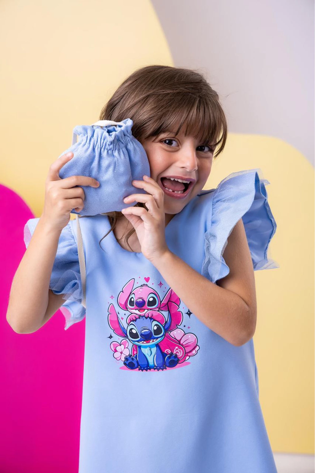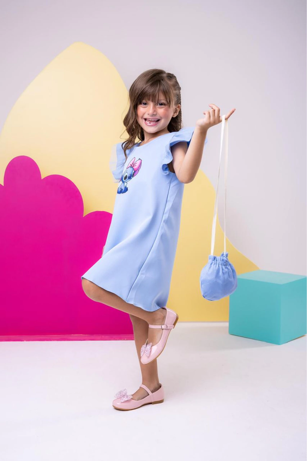 Detalhes: Vestido leve com babado de tule brilhoso na manga e acompanha uma bolsa.